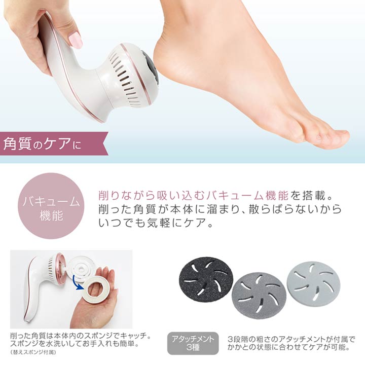 3つの粗さから選べるアタッチメントと2種類の回転スピード(高速・低速)で気になるところをしっかりケア。